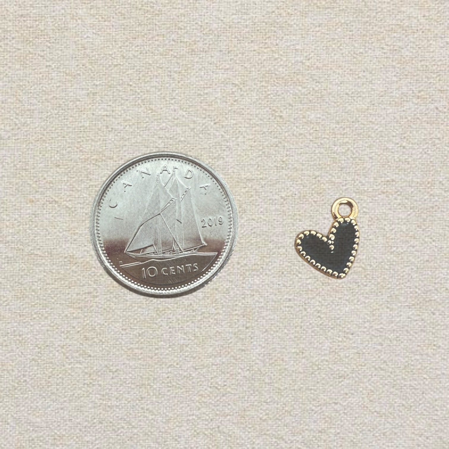 Add a touch of romance and elegance to your jewelry with this dainty black heart charm. Featuring a gold-tone beaded border, this charm combines classic design with a modern twist, making it a versatile addition to any bracelet or necklace. Wear it alone for a chic statement or mix it with other charms for a personalized look. Simply add your selected charms and a chain or bracelet to your cart, and we’ll handle the rest. For a balanced style, we recommend one charm on a beaded bracelet, 3–5 charms on a standard bracelet, or 5–7 charms on a necklace.