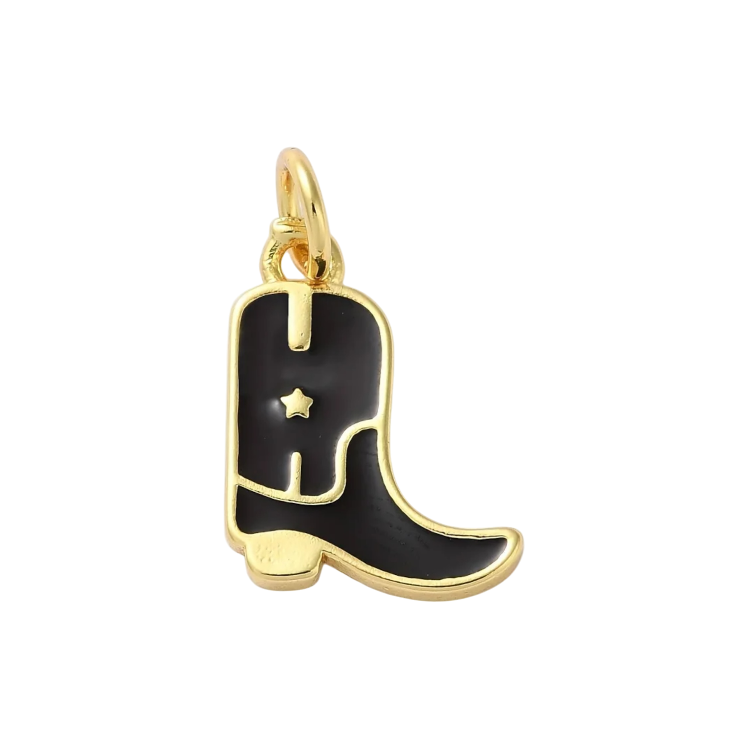 Embrace a touch of Western charm with this gold and black enamel cowboy boot charm. Featuring intricate detailing and a sleek enamel finish, this charm adds a bold and stylish flair to any bracelet or necklace. Wear it alone for a statement look, or pair it with other charms to create a unique, personalized accessory.