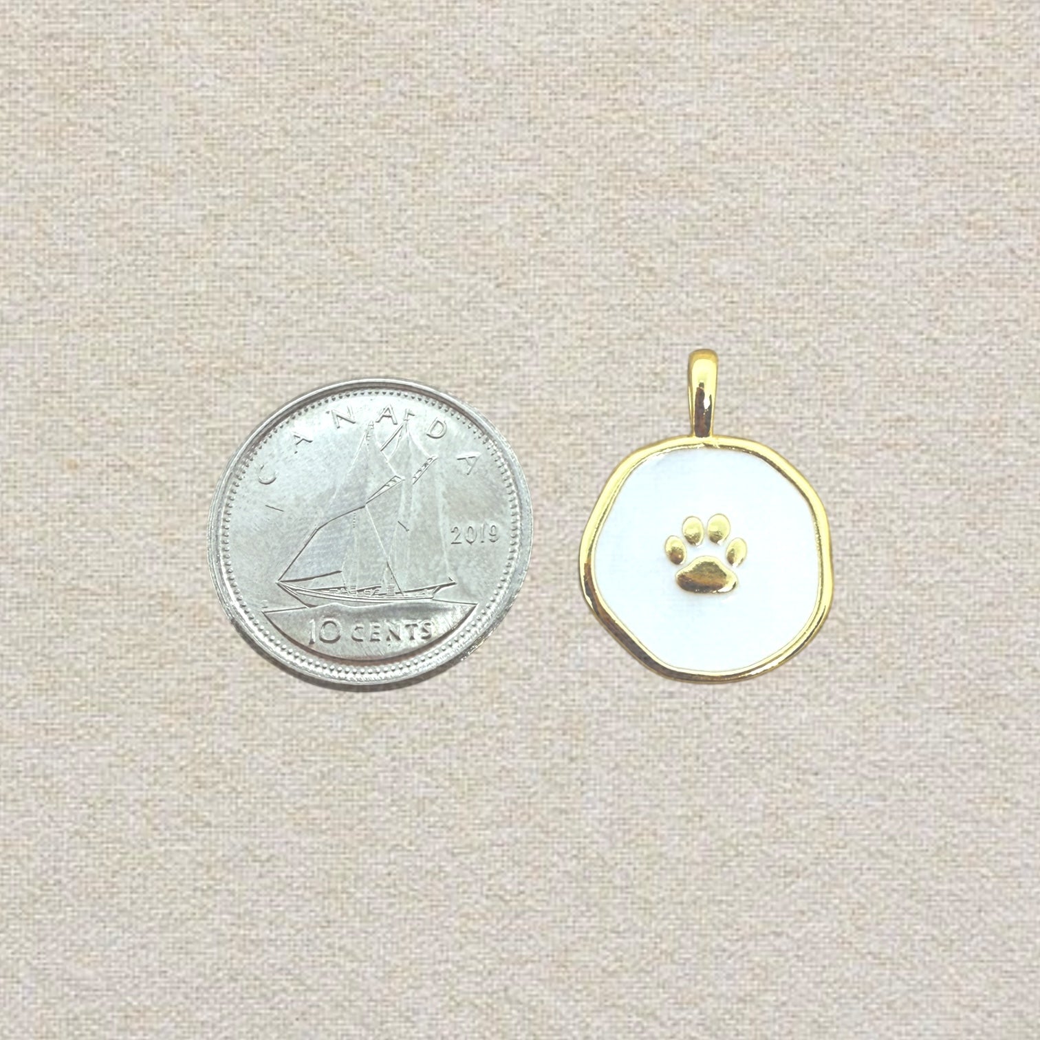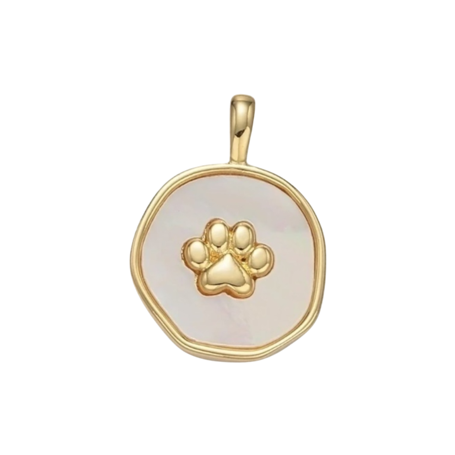 Celebrate your love for pets with this charming paw print pendant. Designed with a soft, organic shape and a beautiful gold paw detail against a mother-of-pearl-like background, this piece is perfect for animal lovers looking to add a touch of elegance to their jewelry. Wear it solo on a necklace or pair it with other charms for a unique, personalized look.