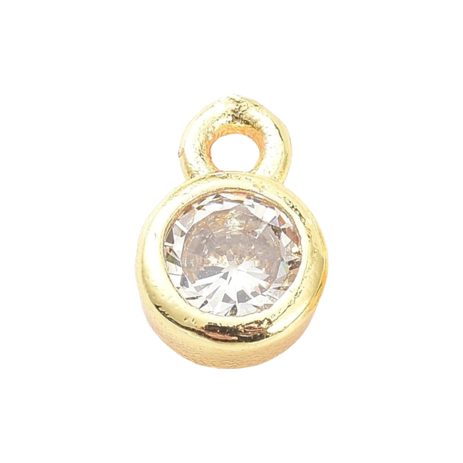 This elegant gold charm with a sparkling crystal center adds a touch of timeless beauty to any jewelry piece. Its simple, bezel-set design makes it perfect for wearing alone for a subtle sparkle or layering with other charms for a more personalized look on a bracelet or necklace.