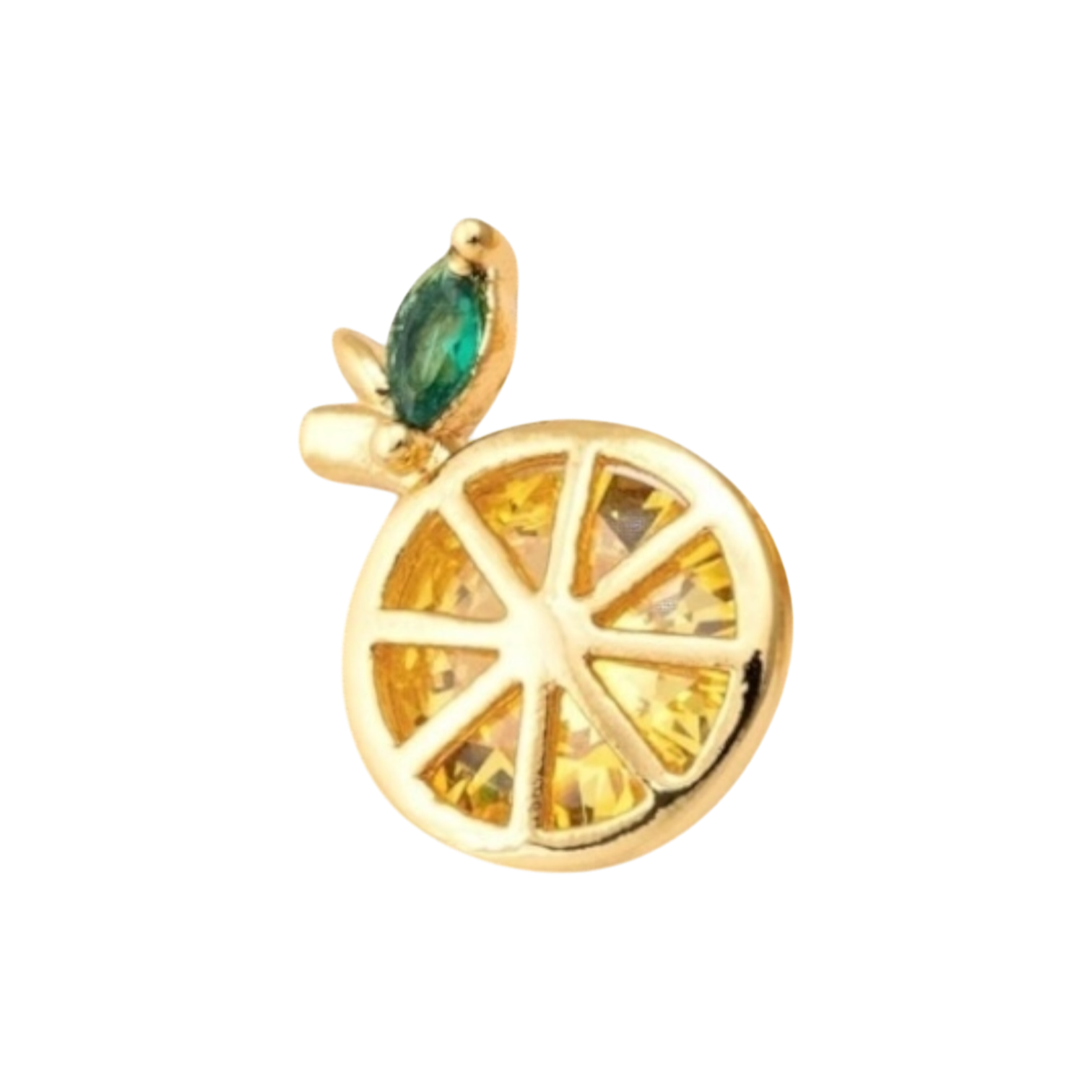 Add a vibrant touch to your jewelry collection with this refreshing gold citrus slice charm. Featuring a sparkling yellow gemstone as the "citrus" and a small green leaf accent, this charm brings a fun, summery feel to any bracelet or necklace. Crafted with 14k gold plating, it’s waterproof and tarnish-resistant, ensuring long-lasting shine and durability. Wear it solo for a pop of color or pair it with other charms for a playful, personalized look. Simply add your selected charms and a chain or bracelet to your cart, and we’ll handle the rest. For a balanced style, we recommend one charm on a beaded bracelet, 3–5 charms on a standard bracelet, or 5–7 charms on a necklace.