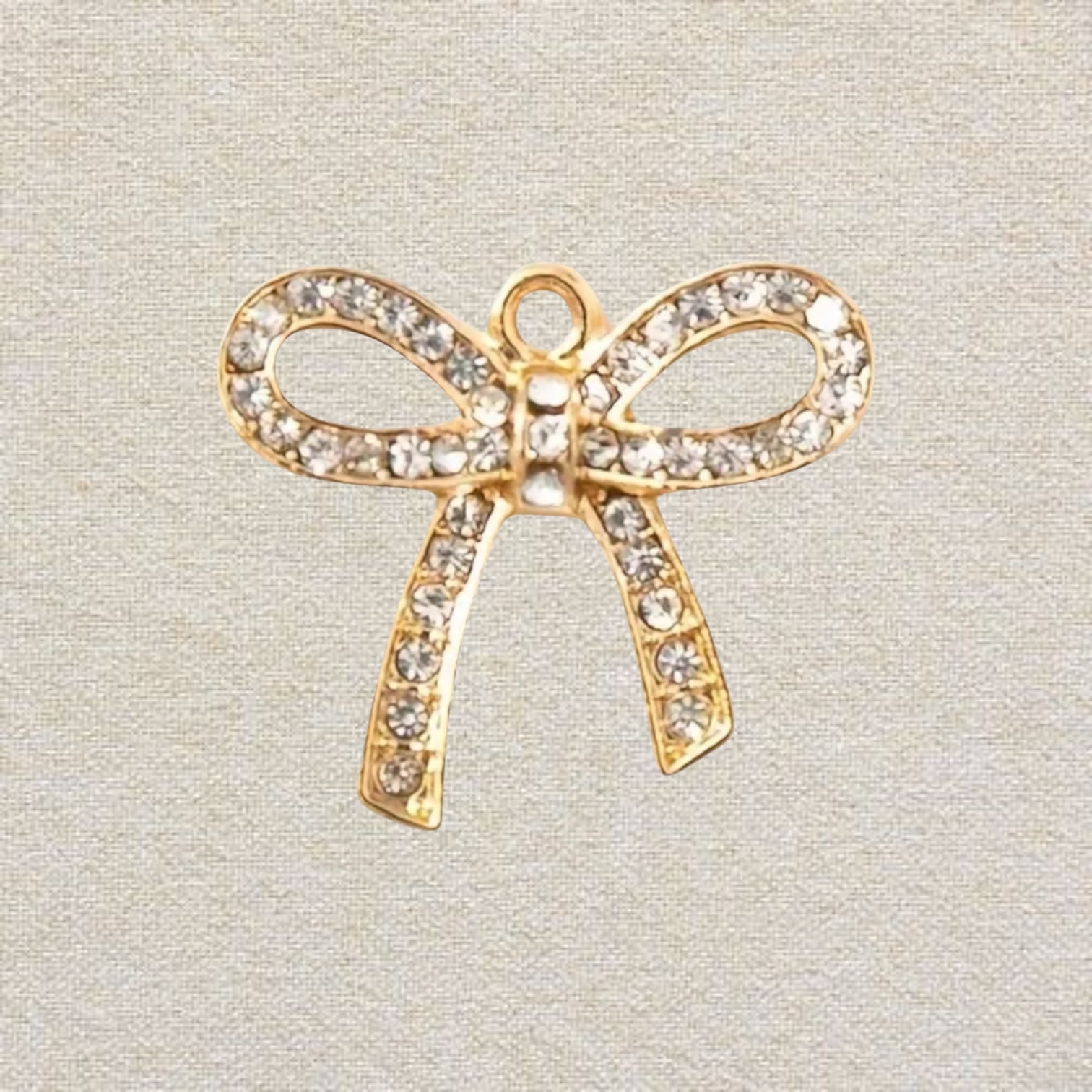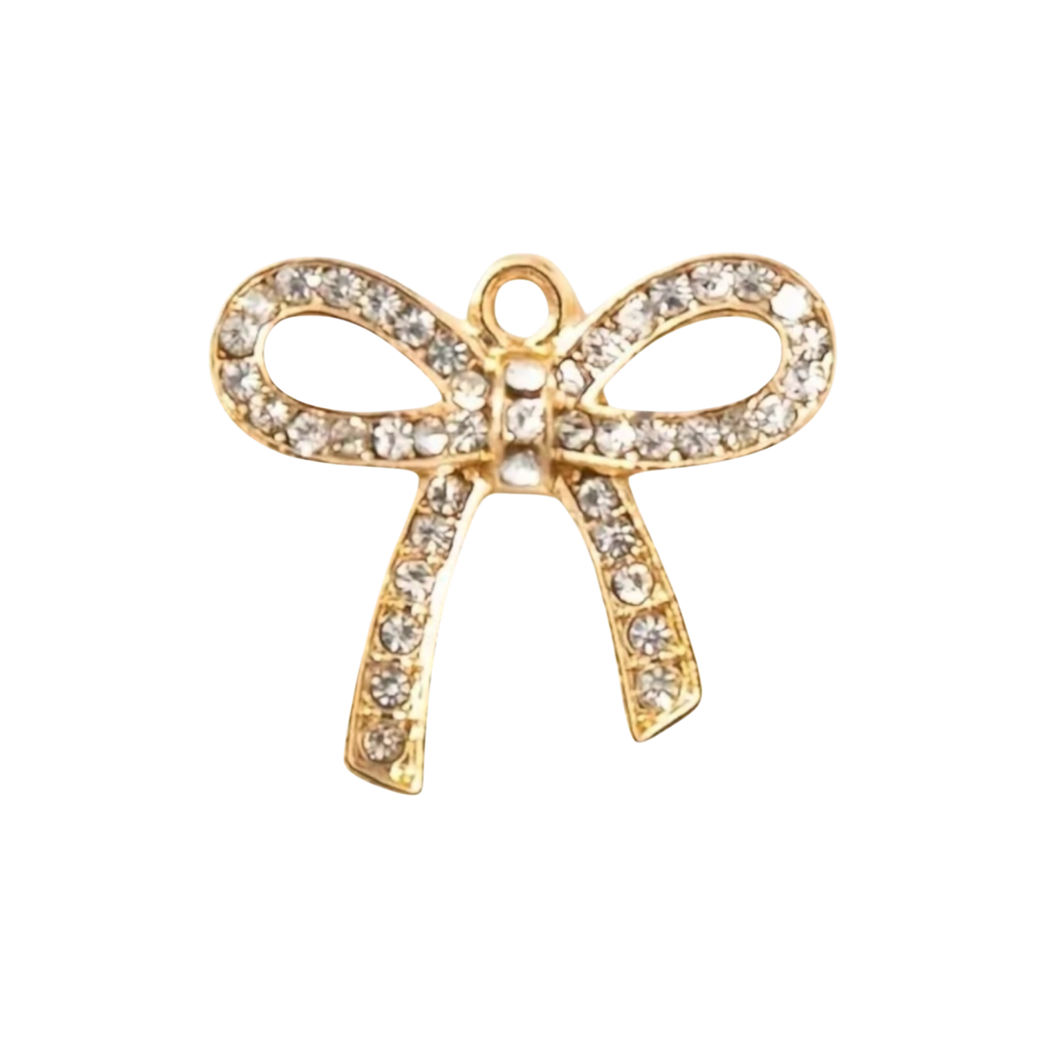 Add a touch of sparkle and elegance to your jewelry with this charming bow pendant, delicately adorned with shimmering crystals. This 14k gold-plated charm is designed to catch the light beautifully, adding sophistication to any bracelet or necklace. Its waterproof and tarnish-resistant finish ensures it remains radiant through daily wear, making it a timeless addition to your collection. Perfect for layering or wearing as a standalone piece, this bow charm adds a refined, feminine touch to any look.