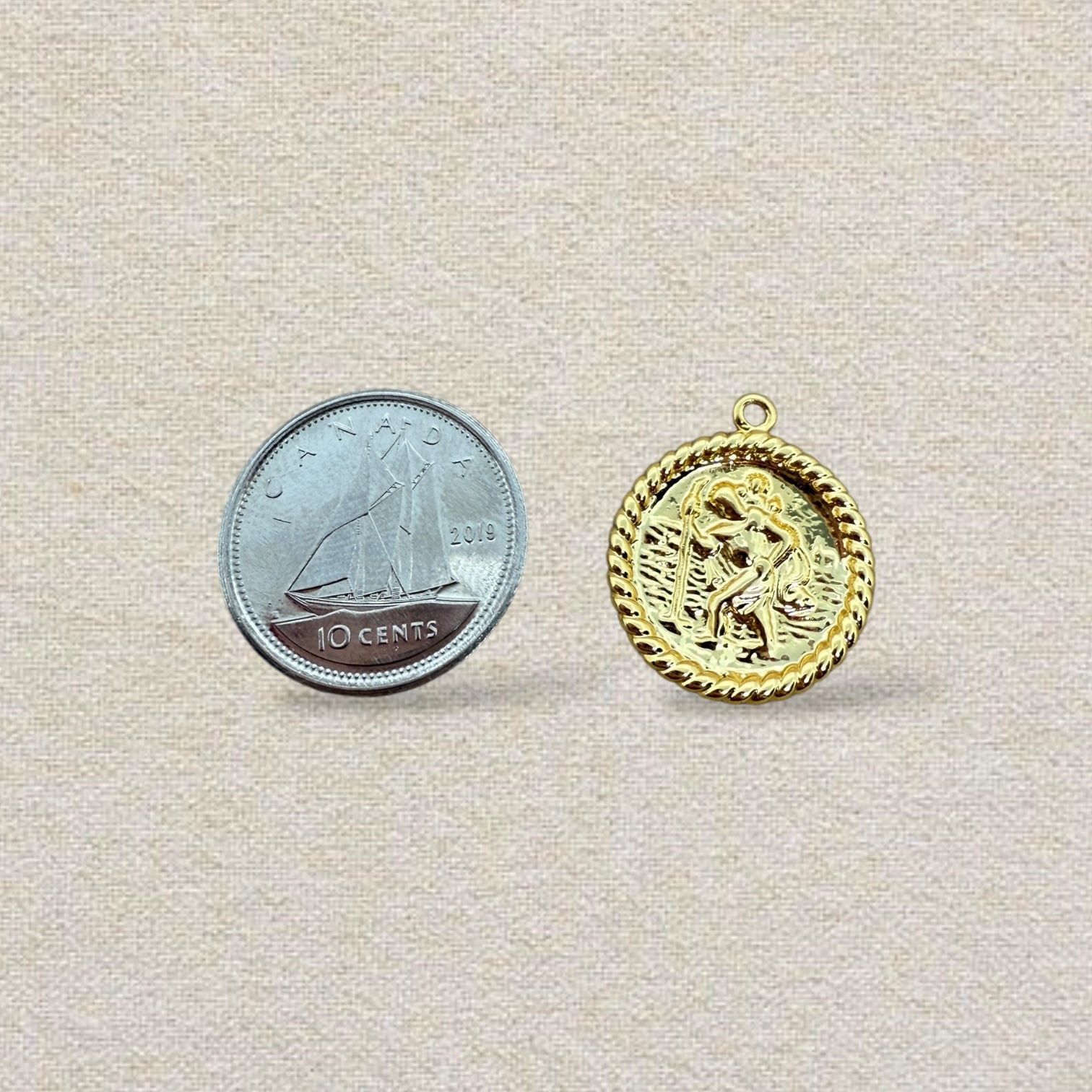This intricate Saint Christopher medallion charm is a meaningful symbol of protection and safe travels, making it a thoughtful addition to any jewelry collection. Crafted in 14k gold plating, this medallion features a detailed depiction of Saint Christopher carrying a child across water, framed by a braided border for a classic, vintage-inspired look. Waterproof and tarnish-resistant, this charm is designed to retain its beauty through everyday adventures. Perfect for a bracelet, necklace, or anklet, it adds a touch of spirituality and timeless style to any piece.