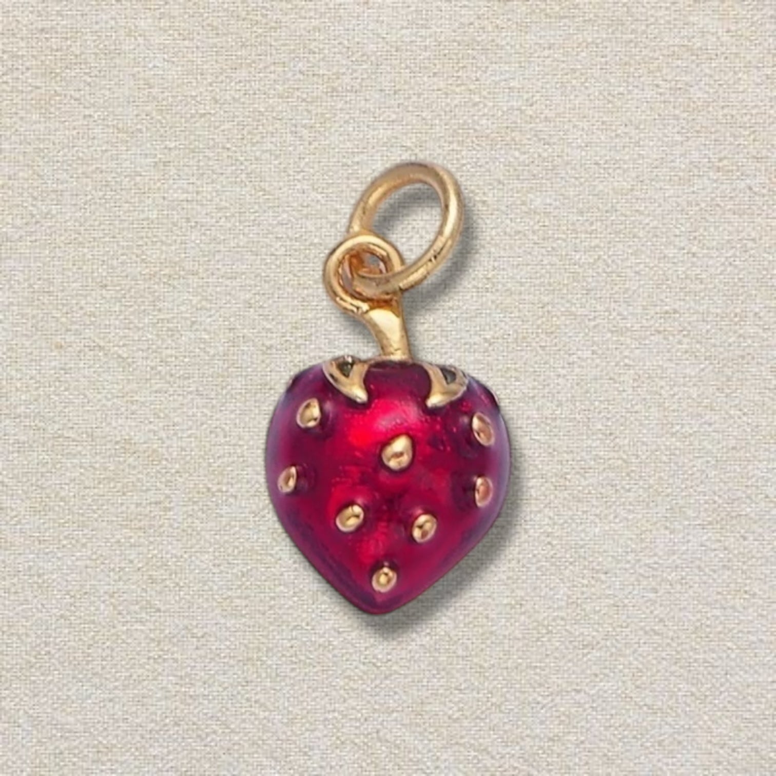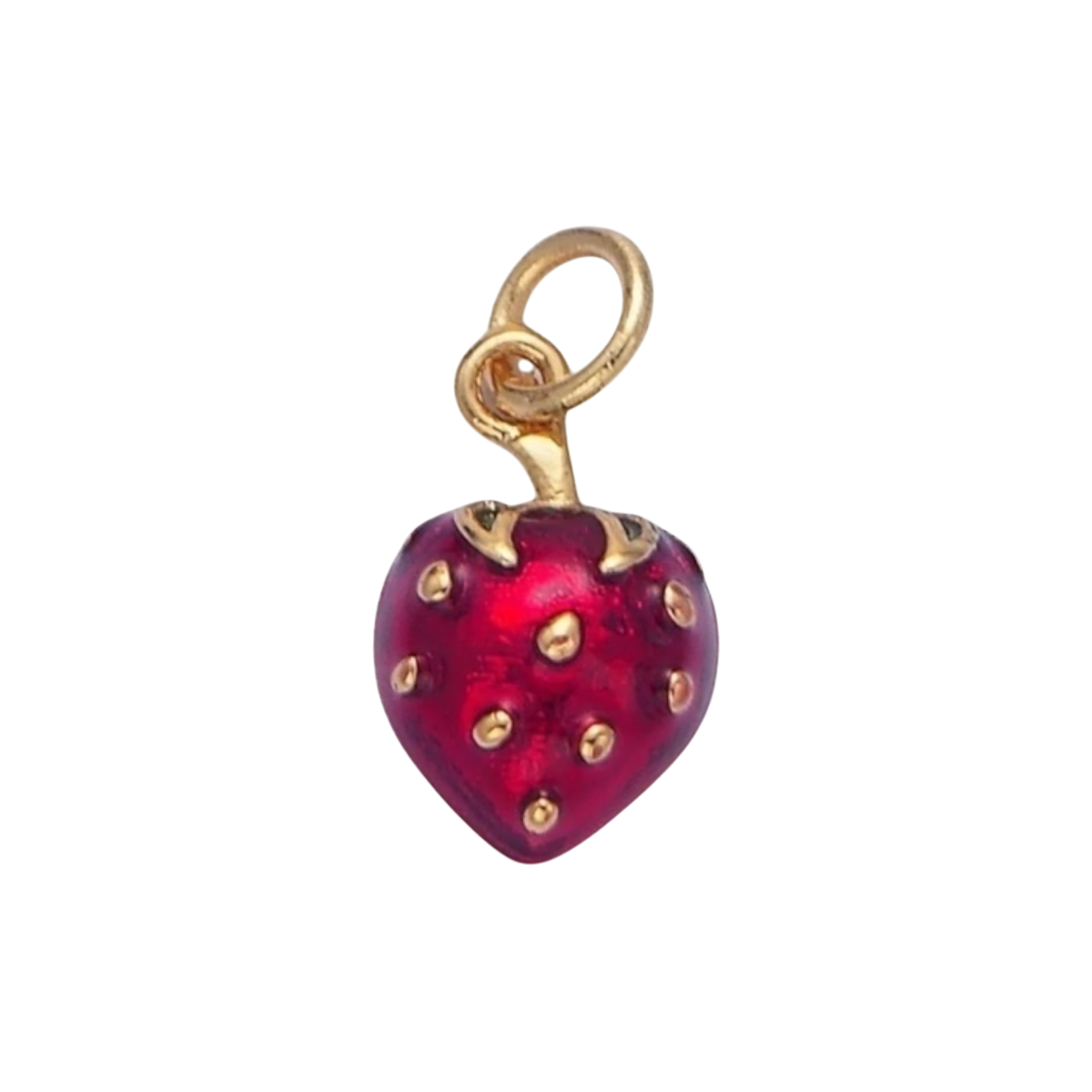 This sweet strawberry charm adds a fun, fruity flair to any jewelry piece. With vibrant red enamel for the strawberries and green for the leaves, all set in 14k gold plating, this charm brings a pop of color and whimsy to your collection. Waterproof and tarnish-resistant, it's perfect for everyday wear on a bracelet, necklace, or anklet. Wear it solo for a playful statement, or pair it with other charms for a vibrant, personalized look.
